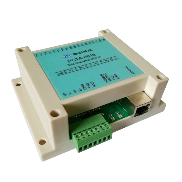 此款数据采集模块内置8通道24位ADC,并内置冷端补偿温度传感器。热电偶模拟信号由ADC转换为数字信号并经冷端补偿后,通过ModBus网络传输给PLC、计算机等主机,实现热电偶的分布式采集。